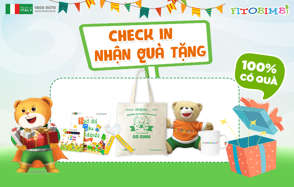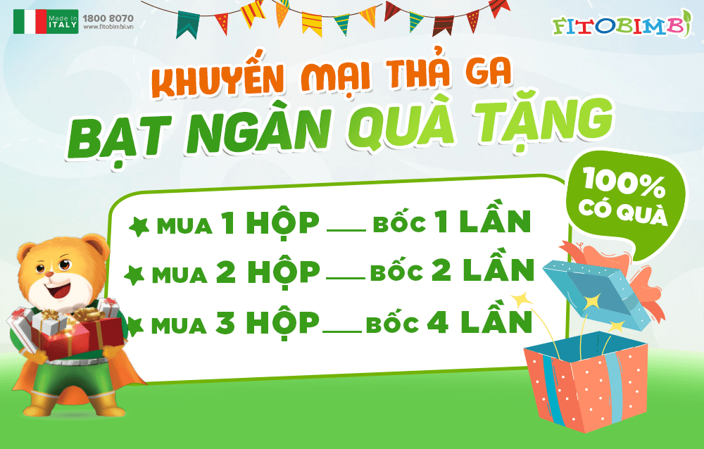 Chương trình bốc thăm trúng thưởng khi mua hàng (100% khách hàng tham gia có quà): mua 1 hộp sản phẩm bất kỳ thuộc nhóm Fitobimbi được bốc thăm 1 lần, mua 2 hộp sản phẩm được bốc thăm 2 lần. Tương tự như vậy, nếu ba mẹ mua 3 hoặc 4 hộp sản phẩm số lần bốc thăm tương ứng sẽ là 3 và 4. Đặc biệt, chỉ cần check in tại gian hàng Fitobimbi, khách hàng sẽ nhận ngay nhiều quà tặng dễ thương như túi canvas, thìa ăn dặm, đĩa ăn dặm, cốc sứ, sách tô màu, … Những quà tặng giá trị trên thay lời tri ân của Fitobimbi gửi đến ba mẹ đã tin tưởng, đồng hành cùng Fitobimbi trong sứ mệnh chăm sóc và bảo vệ sức khỏe cho trẻ em Việt nhiều năm qua.
